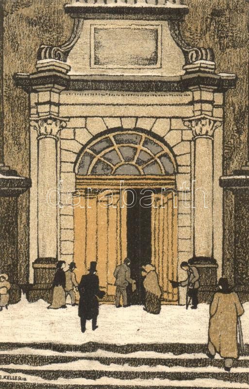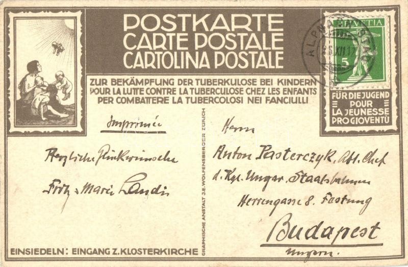 Description: Postkarte zur Bekämpfung der Tuberkulose bei Kindern. Einsiedeln, Eingang z. Klosterkirche / Swiss charity art postcard to fight tuberculosis in children s: E. Keller