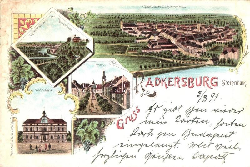 1897 (Vorläufer!) Bad Radkersburg, Platz, Sparkasse, vom Herzogberg / square, savings bank. Weitzinger's floral, Art Nouveau, litho