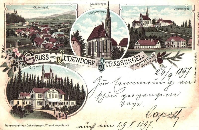 1897 (Vorläufer!) Judendorf-Strassengel, Wallfahrtskirche, Kurhaus / church, spa. Art Nouveau, floral, litho (Rb)