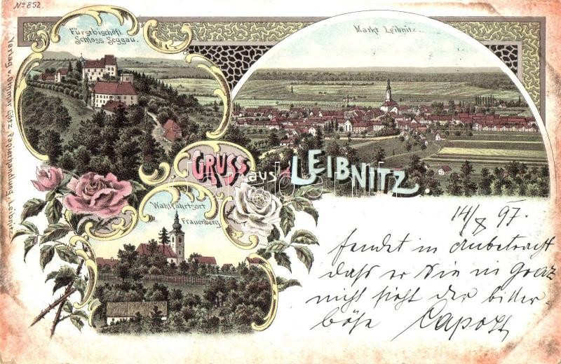 1897 (Vorläufer!) Leibnitz, Fürstbishöfl Schloss Seggau, Wahlfahrtsort Frauenberg / castle, church. Othmar Götz No. 852. Floral, Art Nouveau, litho (EK)