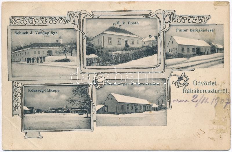 Description: Rábakeresztúr, Heiligenkreuz im Lafnitztal; Schuch J. vendéglője, Posta, Pinter és Rosenberger J. kereskedése, télen / restaurant, post, shops, winter, Art Nouveau (EB)