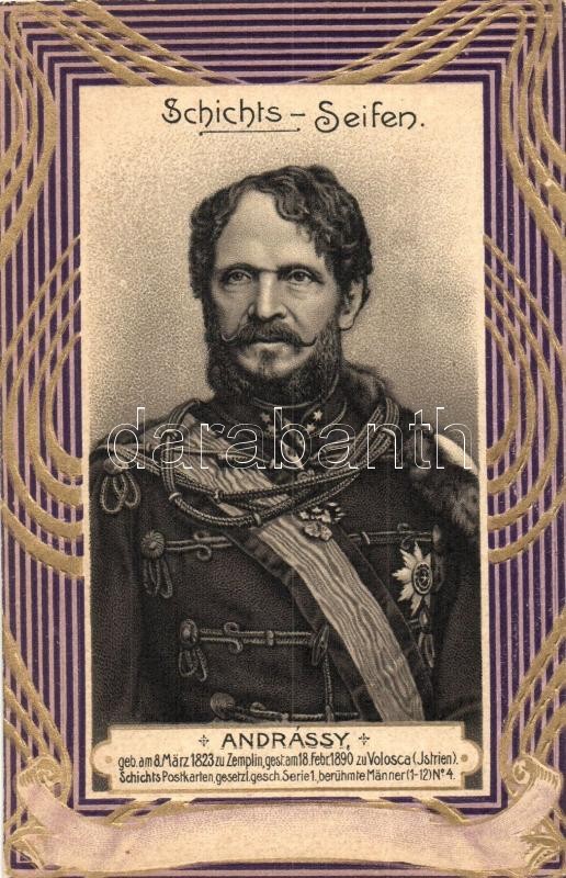 1823-1890 Andrássy Gyula szecessziós, dombornyomott, litho gyászlapja. Georg Schicht kiadása / Schichts-Seifen. Obituary card of Count Gyula Andrássy. Emb. Art Nouveau, litho