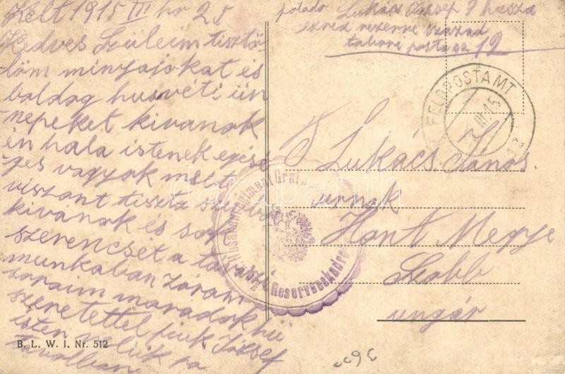 Description: Viribus Unitis propaganda card. Franz Joseph and Charles I of Austria, House of Habsburg, coat of arms s: Charles Scolik + K.u.K. Husarenregiment Graf Nádasdy No. 9. Reserveskadre (ázott sarok / wet corner)