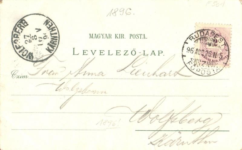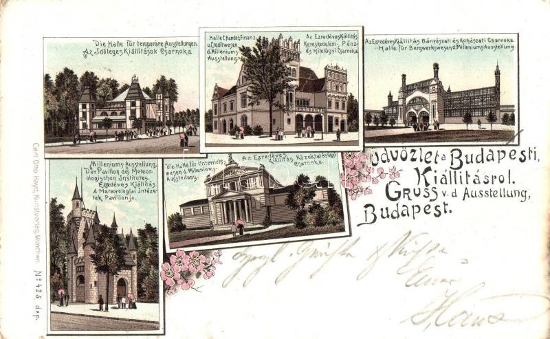 Description: 1896 (Vorläufer!) Budapest, Ezredéves Kiállítás. Időleges Kiállítások, Kereskedelem, Pénz és Hitelügyi, Bányászati, Kohászati és közoktatásügyi csarnokok, Meteorológiai Intézet pavilonja. Car Otto Hayd No. 425. floral, litho (fa)