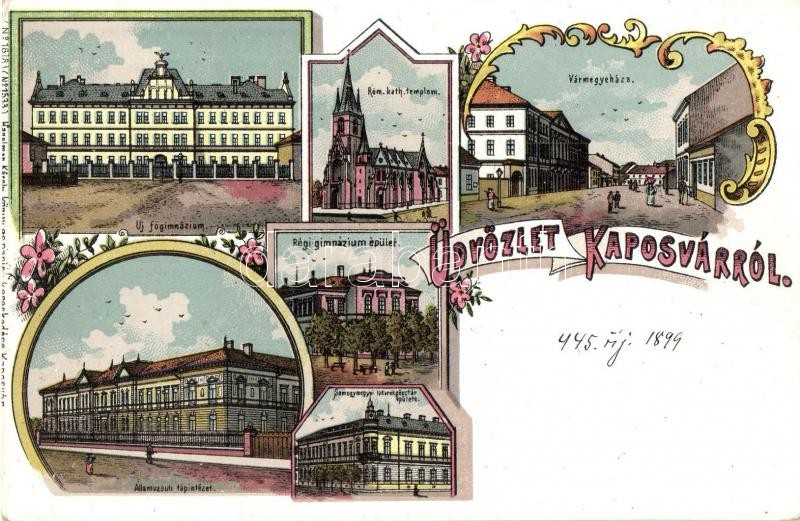 Description: 1899 Kaposvár, Vármegyeháza, takarékpénztár, régi gimnázium, új főgimnázium, államvasúti tápintézet, római katolikus templom, kiadja Hagelman Károly, floral Art Nouveau litho