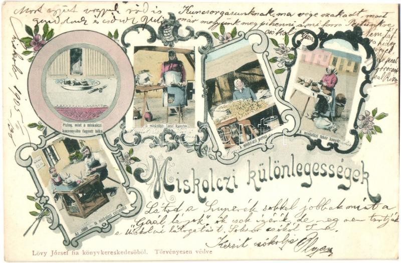 1905 Miskolc, Különlegességek; Béka kocsonya, Lacikonyha, perec, fehér kenyér, 1000. csizmadia. Lövy József fia kiadása, Art Nouveau, floral (EK)