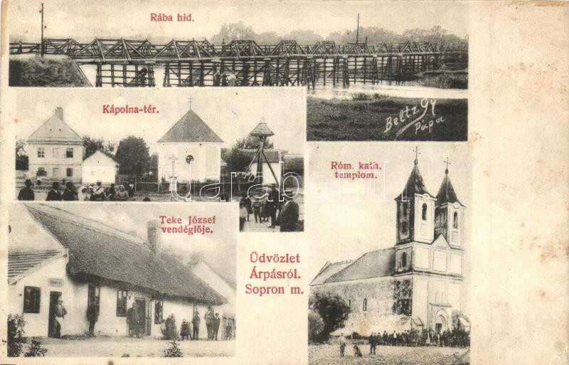 Árpás, Rába híd, Kápolna tér, Római katolikus templom, Teke József vendéglője és saját kiadása. Beltz Gy. fényképezte (fl)