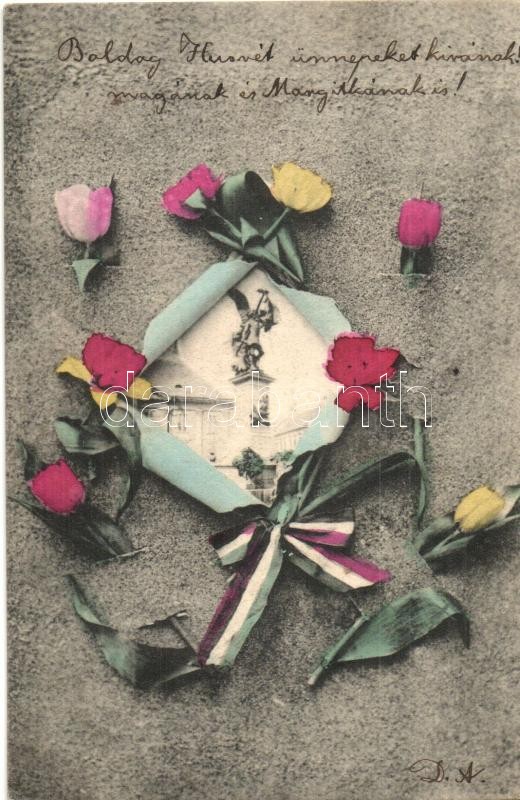 Budapest I. Honvéd szobor a Dísz téren. Tulipános és magyar zászlós montázslap