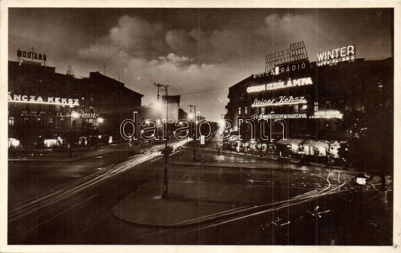 Budapest VI. Oktogon és Andrássy út este, Winter szén, fa és kox, Váncza és Steiner keksz, Orion Izzólámpa, Bember selyem harisnya