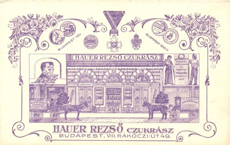 Budapest VIII. Hauer Rezső cukrászdája. díszes reklámlap. Rákóczi út 4...