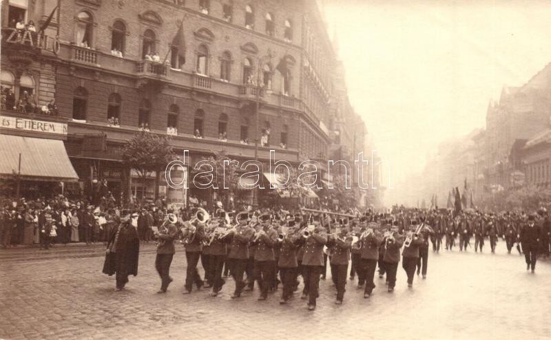 Budapest VIII. Katonai zenekar felvonulás a Baross téren, Skultéty üzlete, szálló és étterem. photo