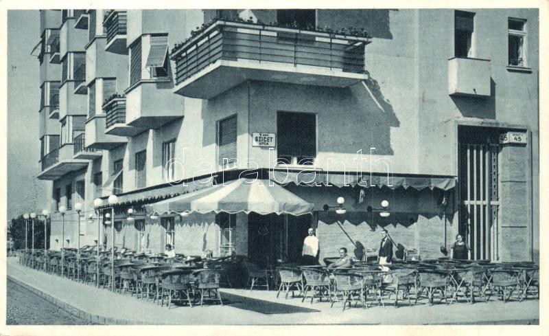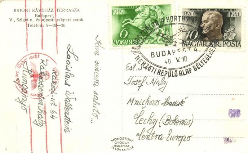 Description: Budapest XIII. Brioni Kávéház terasza. Sziget utca (mai radnóti Miklós utca) és Újpesti rakpart sarka. "1940 Horthy Miklós Nemzeti Repülőalap bélyeg" So. Stpl