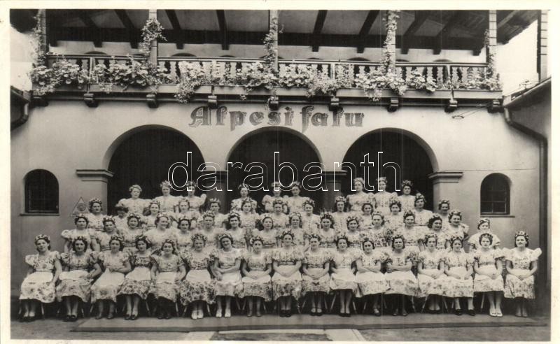 Budapest XIV. Alpesi falu vendéglő, Népviseletbe öltözött lányok csoportképe. Hermina út 59.