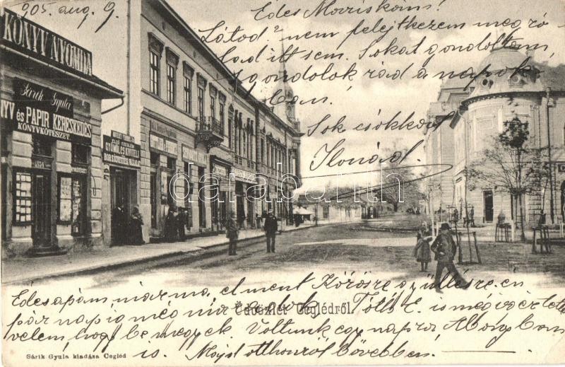 Description: Cegléd, Templom utca, Első ceglédi gyümölcskiviteli és bor közvetítései vállalat, Gottlieb Ferenc, Kohn és Erdős és Schwartz Gyula üzlete, Sárik Gyula könyv- és papírkereskedése és saját kiadása (EK)