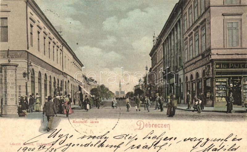 Debrecen, Kossuth utca és Piac utca sarok, hirdetőoszlop, Tóth Gyula és Ifj. Pájer üzlete. László Albert kiadása (EK)
