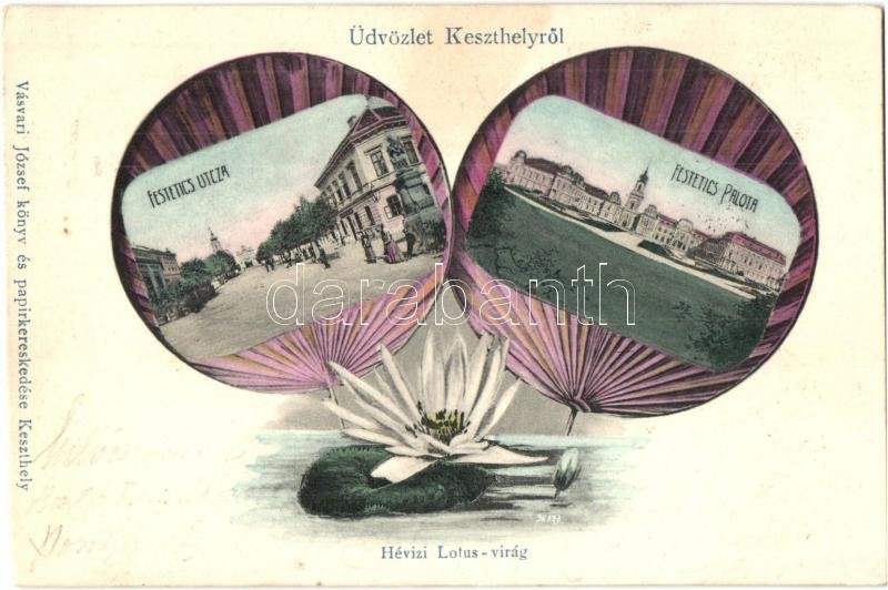 Keszthely, Festetics utca és palota, Hévízi lótuszvirág, gyógyszertár, montázs művészlap. Vasvári József kiadása (EK)