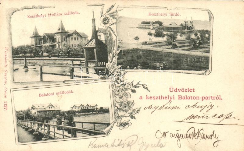 Keszthely, Hullám és Balatoni szállodák, fürdő. Wlaszlovits Gusztáv kiadása, floral Art Nouveau (EK)
