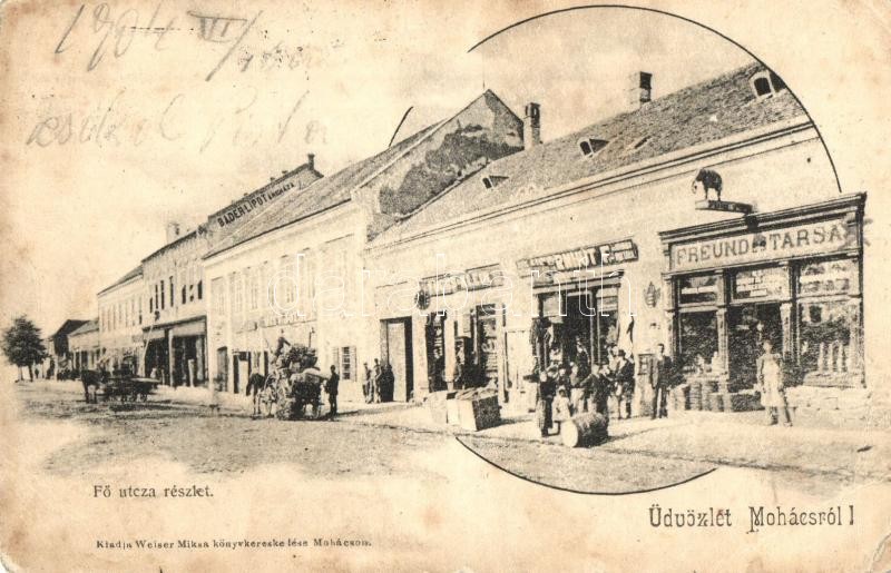Mohács, Fő utca, Bader Lipót áruháza, Freund és Társa, Herrnhut F., Witt József és Fuchs és Klein üzlete (EB)
