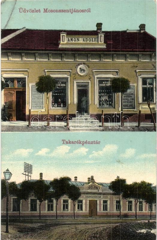 Mosonszentjános, Jánossomorja; Takarékpénztár, Amon Adolf üzlete és saját kiadása (apró szakadás / small tear)