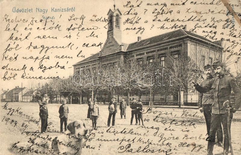 Nagykanizsa, utcakép kutyával, Városi közkórház, montázslap katonákkal...