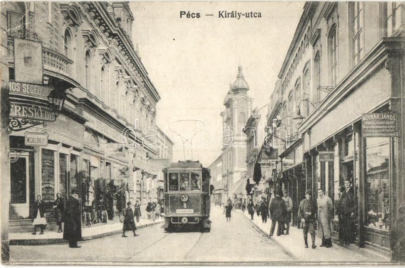 Pécs, Király utca a 8-as villamossal, megállóhely, Balog György kereskedése, Spiegel József cipő áruháza, Molnár János üzlete (r)