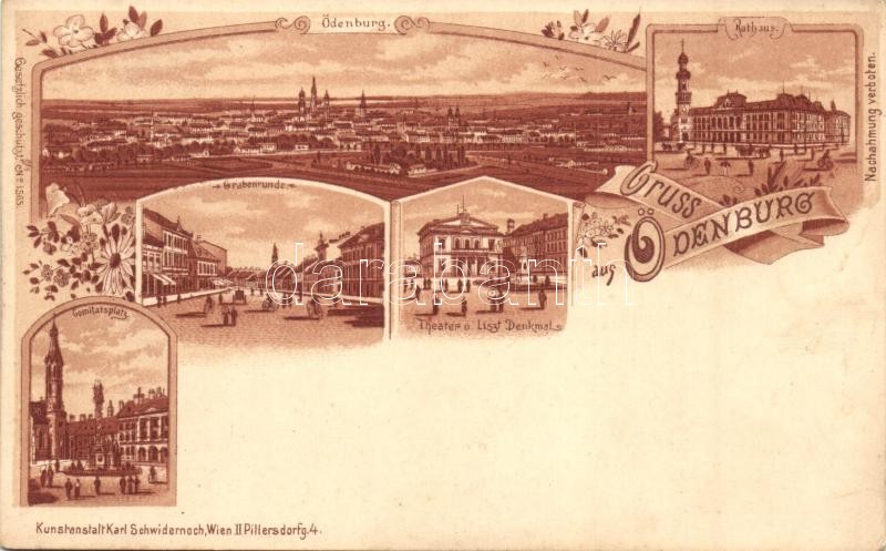 Sopron, Oedenburg; Várkerület, tér, Liszt szobor, színház, Vársoház. Kunstanstalt Karl Schwidernoch No. 1565. Art Nouveau, floral, litho