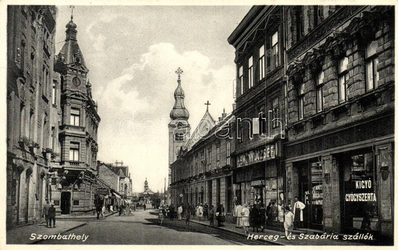 Szombathely, Herceg és Szabária szállók, Kígyó gyógyszertár, Kemény Jó...