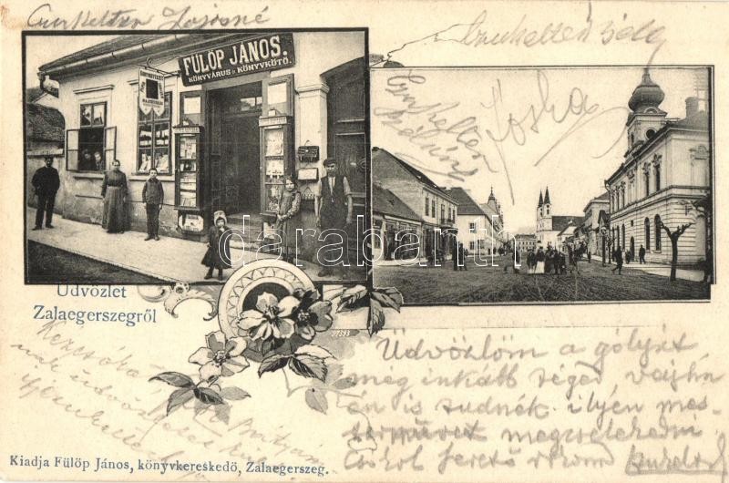 Zalaegerszeg, utcakép, Fülöp János könyvárus és könyvkötő üzlete és saját kiadása. floral Art Nouveau (EK)