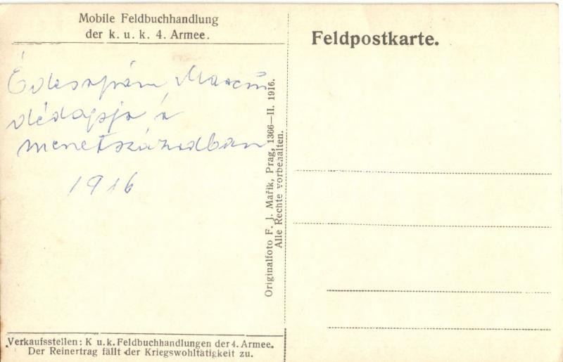 1916 Mobile Feldbuchhandlung der k.u.k. 4. Armee / A k.u.k. 4. század ... https://www.darabanth.com/en/28-Major-auction/28.1/Postcards/Militaria~11366/1916-Mobile-Feldbuchhandlung-der-kuk-4-Armee-A-kuk-4-szazad-Mozgo-konyvesboltja-WWI-K~II1647081