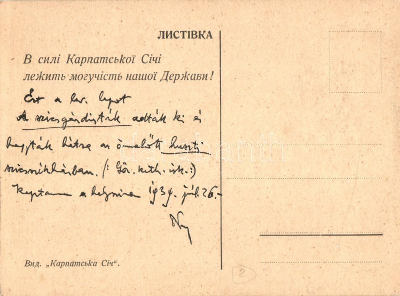 Description: 1939 Szics-gárdista propagandalap, melyet a huszti szicsgárdista székházban hagytak hátra / WWII Carpathian Sich propaganda card from the headquarters in Khust