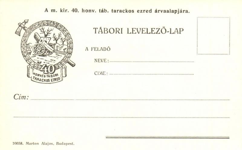 40. Honvéd Tábori Tarackos Ezred árva alap segélylap / Hungarian WWI military charity card