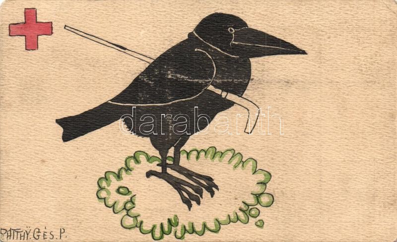 Kézzel rajzolt első világháborús segélylap az orosházi hadiárvák javára / WWI Hungarian military Red Cross charity art postcard s: Pathy G. és P. (fa)