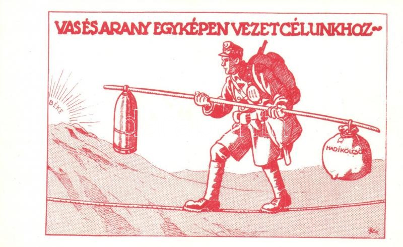 Vas és arany egyképen vezet célunkhoz. Hadikölcsön propagandalap / WWI K.u.K. military loan propaganda card s: Bér