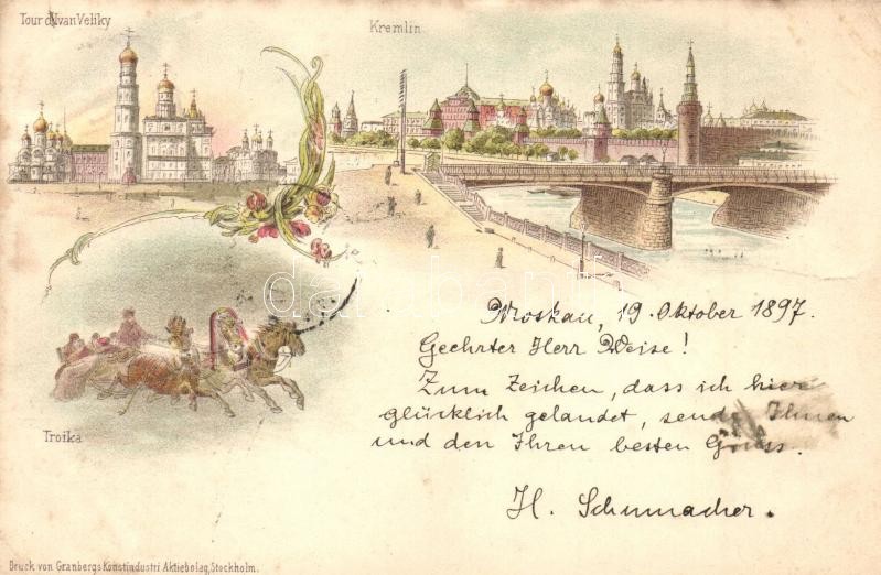 1897 (Vorläufer!) Moscow, Moskau; Kremlin, Tour d'Ivan Veliky, Troika. Granbergs Konstindustri's Floral, litho (EK)