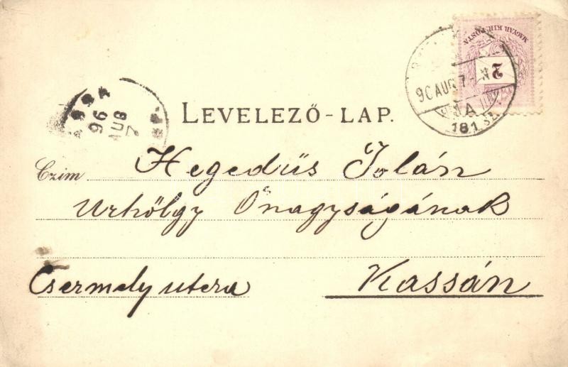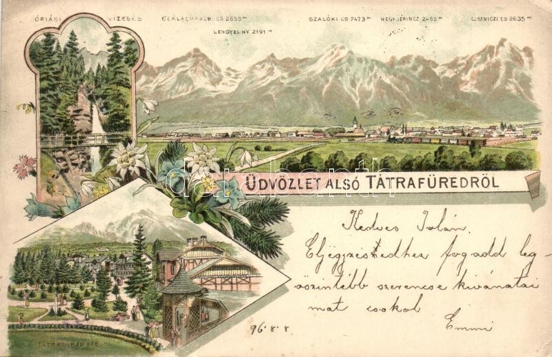 1896 (Vorläufer!) Alsótátrafüred, Dolny Smokovec; Óriási vízesés, hegycsúcsok / waterfall. mountain peaks. Art Nouveau, floral, litho (EK)