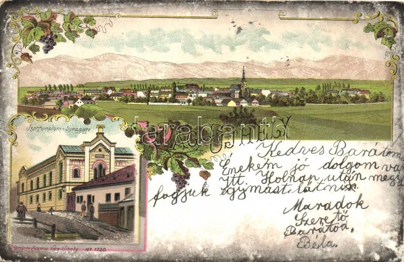 1899 Vágújhely, Nové Mesto nad Váhom, Waag-Neustadtl; Izraelita templom, zsinagóga. Brück Samu No. 1720. szőlős szecessziós művészlap / Synagogue. Art Nouveau, floral, litho (kopott sarkak / worn corners)