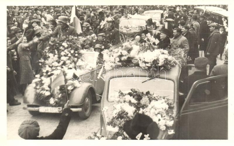 1938 Léva, Levice; bevonulás virágokkal díszített automobilokkal / ent...