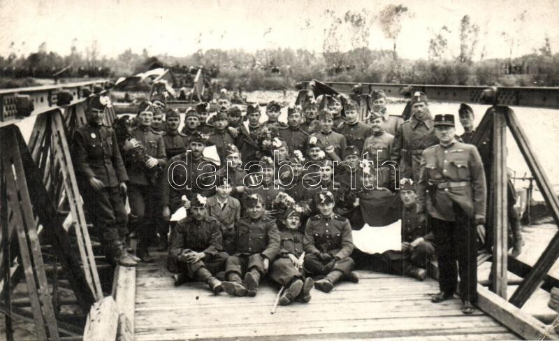 Description: 1938 Medve, Medvedov; bevonulás, utászok csoportképe a hídon való átkeléskor. Dobos felvétele / entry of the Hungarian troops, soldiers' group photo on the bridge during river crossing. photo (EK)