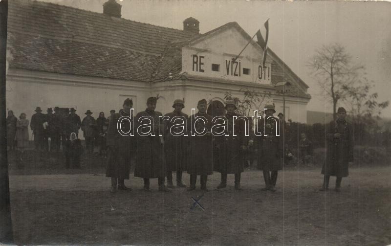 Description: 1938 Pelsőc, Pelsücz, Plesivec; bevonulás, "Revíziót!" felirat. M. kir. Dobó István 14. honvéd utászezred III. zászlóalj parancsnoksága / entry of the Hungarian troops, soldiers' group photo