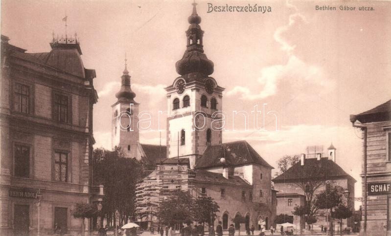 Description: Besztercebánya, Banska Bystrica; Bethlen Gábor utca, felállványozott templom építkezés közben, Teich Adolf üzlete / street vire with church construction, shops
