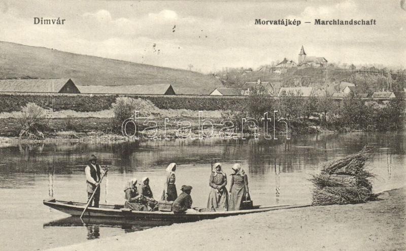 Dimvár, Dimburg, Suchohrad; Morvatájkép révésszel / Marchlandschaft / river with ferryman
