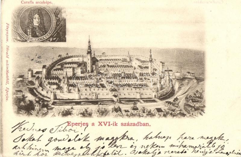 Eperjes, Presov; a XVI. században, Caraffa arcképe. Divald / in the 16...