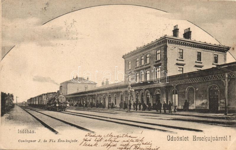 Érsekújvár, Nové Zamky; Vasútállomás gőzmozdonnyal / Bahnhof / railway station with locomotive (EK)