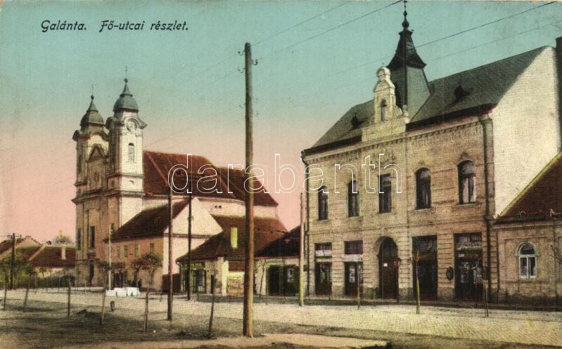 Galánta, Fő utca, templom, üzletek / main street, church, shops