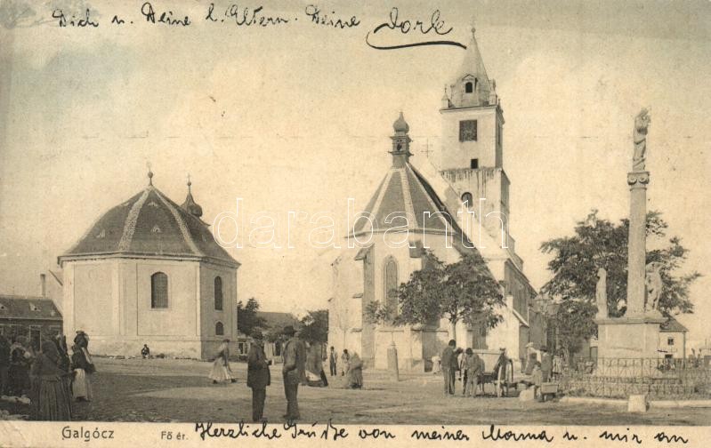 Galgóc, Hlohovec; Fő tér, templom, Szentháromság szobor, piac / main s...