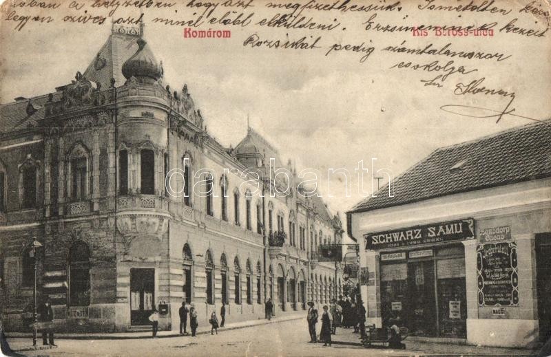 Komárom, Komárno; Kis Baross utca, Schwarz Samu fűszer és csemege kereskedése / street view with shop (EK)