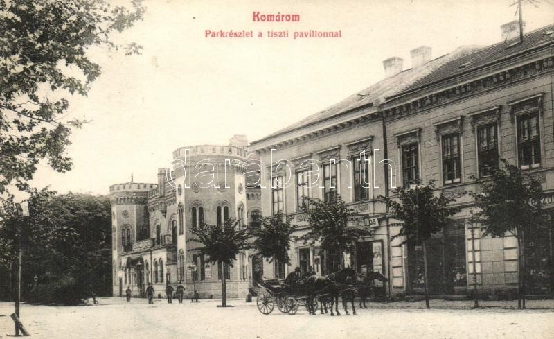 Komárom, Komárno; Park részlet a Tiszti pavilonnal, Pollák Lajos üzlet...