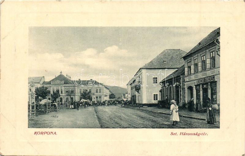 Korpona, Krupina; Szentháromság tér, piac, Reviczky Frigyes üzlete és ...