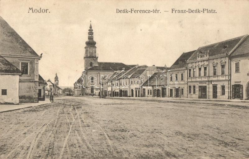 Modor, Modra; Deák Ferenc tér, üzletek, templom, Posta szálló. Levius ...