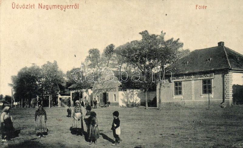 Nagymegyer, Velky Meder; Fő tér, Vidéki Takarékpénztár, Bor, sör és pálinkamérés / main square with savings bank and beer hall